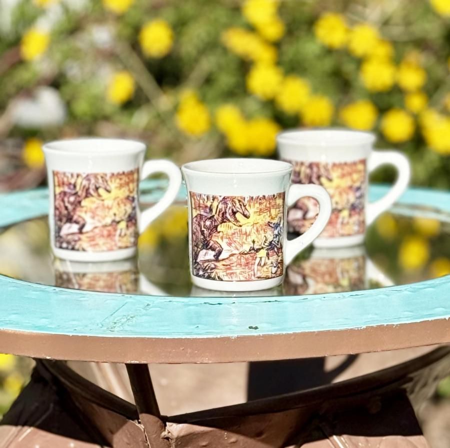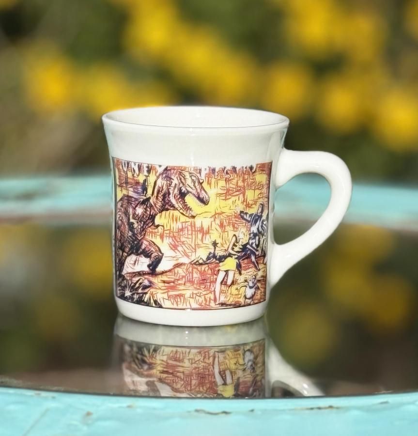 彼のシルクプリント作品からです。マグの形もなかなか良いし、陶器のクオリティは日本製にこだわりました。